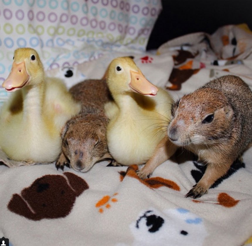 この画像を大きなサイズで見る地球上でもっとも癒される光景が広がっていた。仲間の数は5。1匹の犬に2羽のアヒルに2匹のプレーリードッグが、きゃっきゃうふふと仲良く暮らしているという。