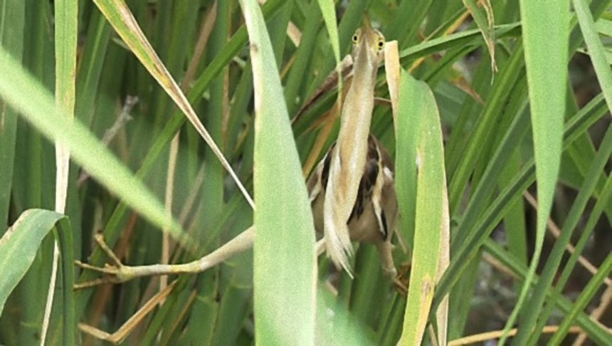 この画像を大きなサイズで見る危険を感じると上を見上げて首を伸ばし、静止したり左右に揺れ、ヨシの草に擬態する。ヨシゴイの羽の模様がヨシの草との見分けづらくなるという。