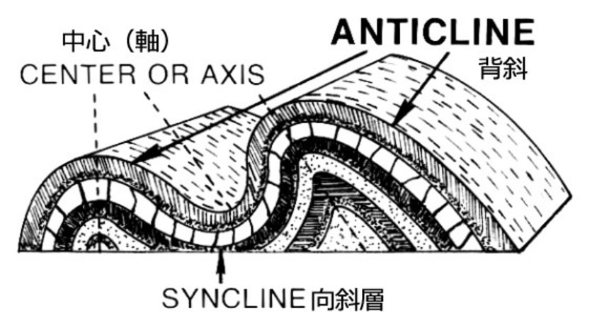 背斜とは、簡単に言うと、地層が折れ曲がったもので、中央に向かうほど古い地層になる。いくつもの人形が入っているロシアのマトリョーシカ人形の一番上側を想像すればいいだろう。