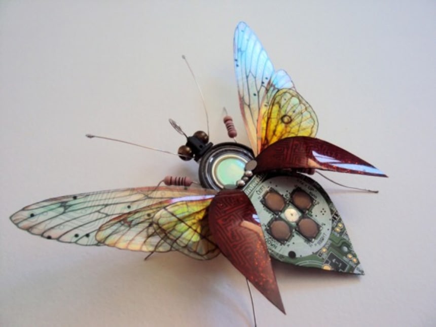 色とりどりの羽を持つ基盤や電子回路で作った昆虫たち。イギリスに住むアーティストのジュリー・アリス・チャペルが作り上げたものだ。
