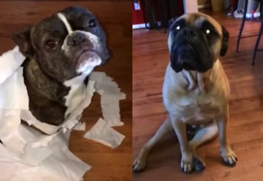 体全部がトイレットペーパーまみれとなっているフレンチブルドッグ。まあやったわな。確実にやっちゃったわな。でもって、飼い主の問いにはバツの悪そうな顔をしているわけだけど、一方ブルマスチフの場合には、「誰がやったの?」と問われその前脚をフレンチブルドック方面へと