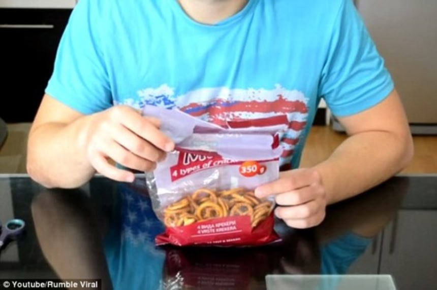 日本のスナック菓子だと袋の余りが短いから、やりにくいというかできないって言うオチが待ってたけど