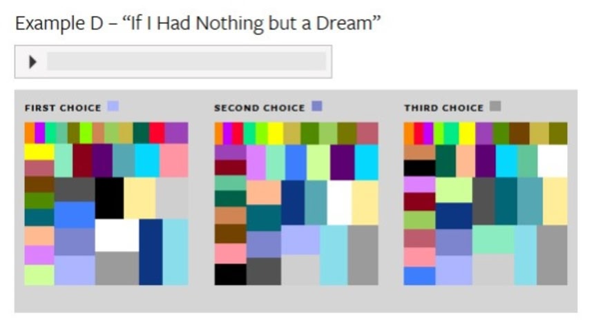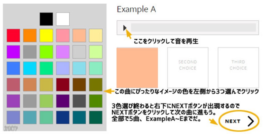 ページをスクロールしていくとカラーチャートが見えてくる。 再生ボタンを押すと曲が流れてくるので、各曲ごとにぴったりだと思う色を左の枠の中から3色選んでほしい。選び終わったら、右下のNextを押して次の曲に進もう。曲は全部で5曲ある。