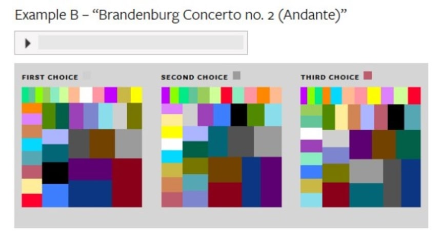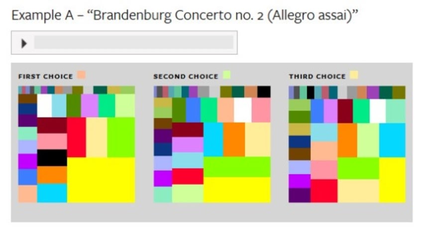 この画像を大きなサイズで見る多くの人が黄色を選び、明るく、色鮮やかな色彩が目立つ。テスト製作者によれば、速いテンポの長調で、トランペットのソロを特徴としていることが原因である。これによって、音楽はアップビートで幸せな雰囲気(しばしば黄色と結びつけられる)を醸している。