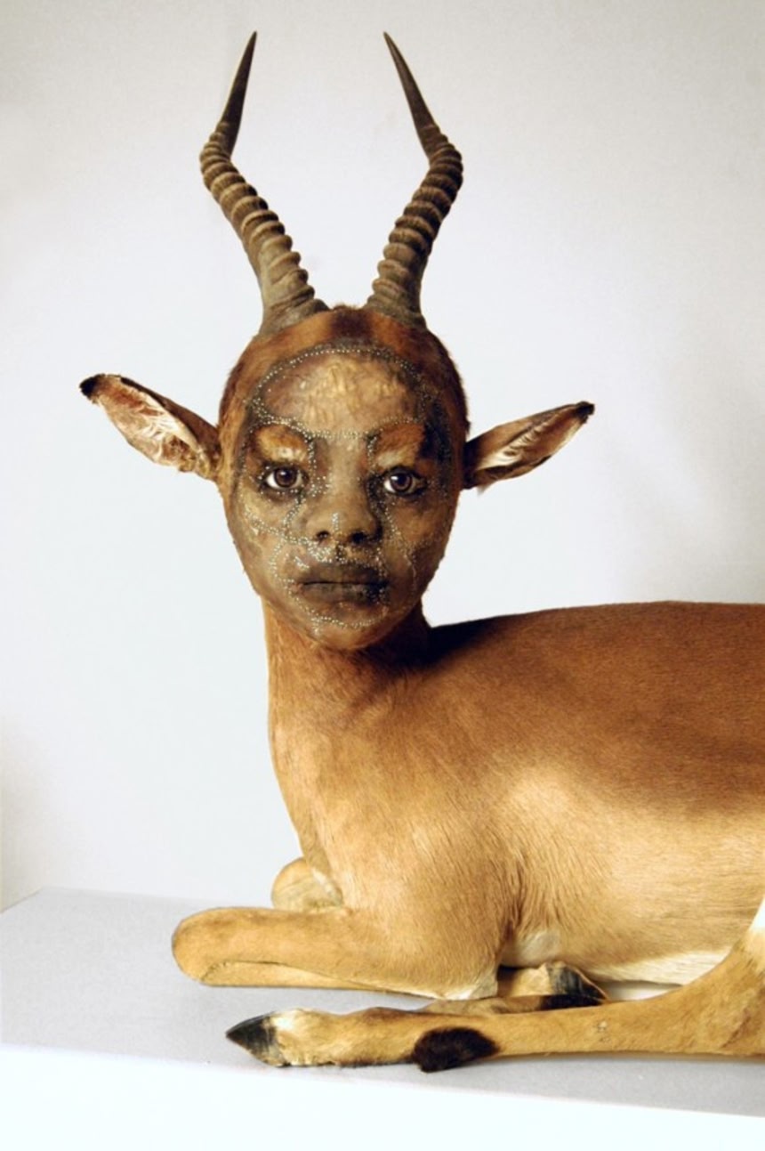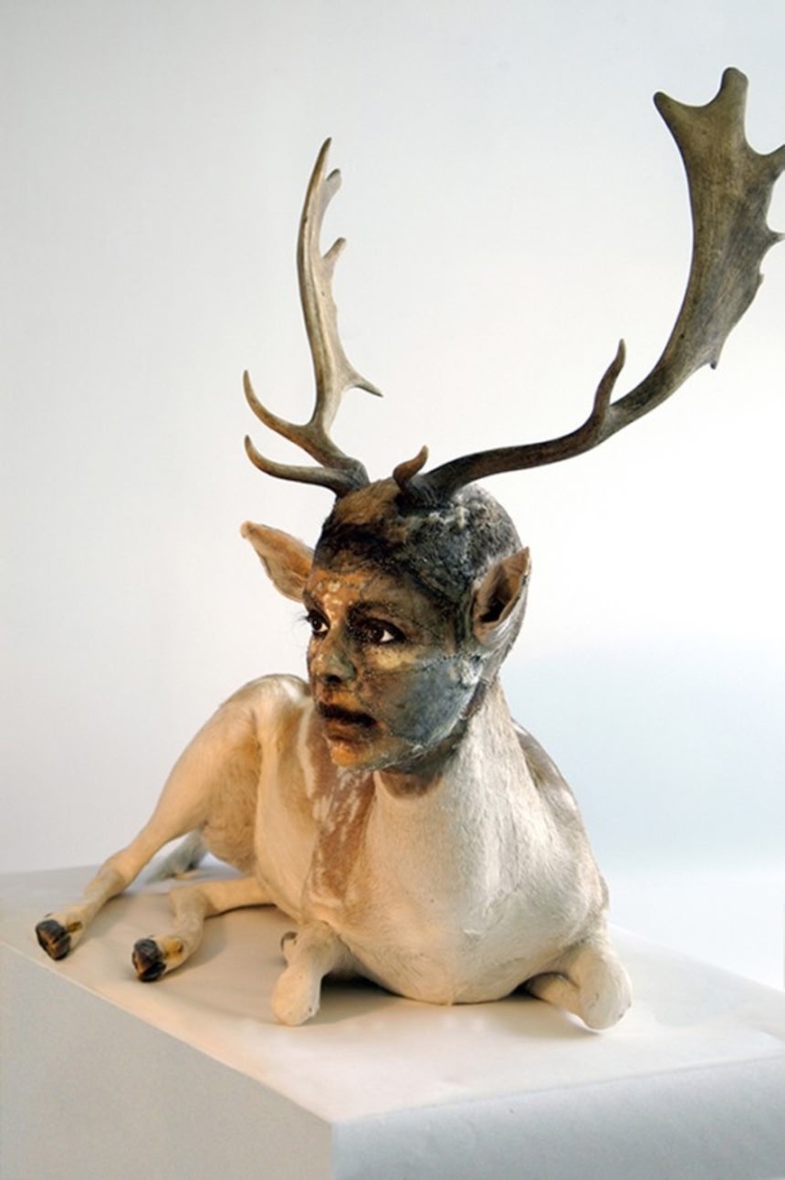 米ニューヨークを拠点に活動している女性アーティスト、ケイト・クラークは動物のはく製に人間の顔を構築することで独特の擬人化めいたスカルプチャーを作り上げている。