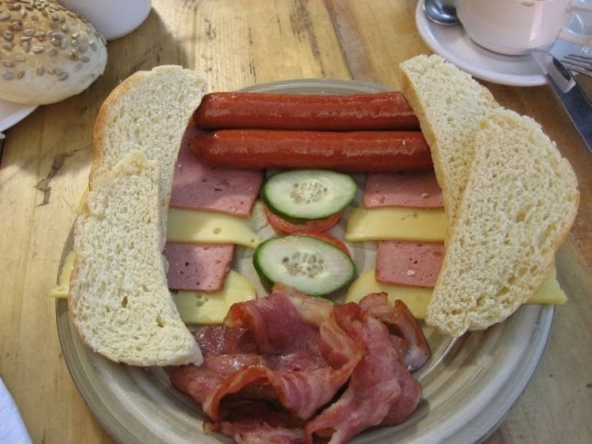 この画像を大きなサイズで見るポーランドの伝統的な朝食は、ソーセージにチーズ、バター、ジャム、チョコレートスプレッドなどを塗ったロールパン。