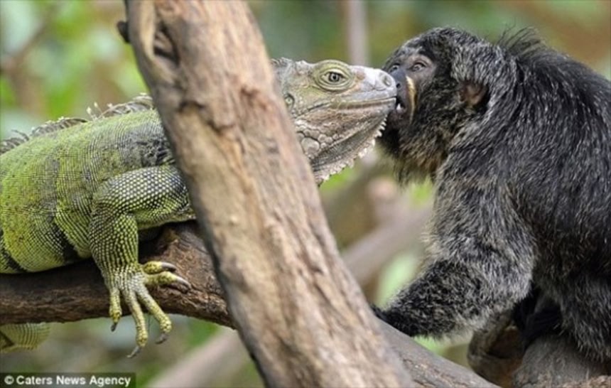 ドイツ、レーフェルト動物園のあるカップルの姿が話題となっている。猿であるマーモセット(メス)が愛情を注いでいるのはグリーンイグアナ。飼育ケージを一緒にしたところすぐに両者は親密な関係となった。