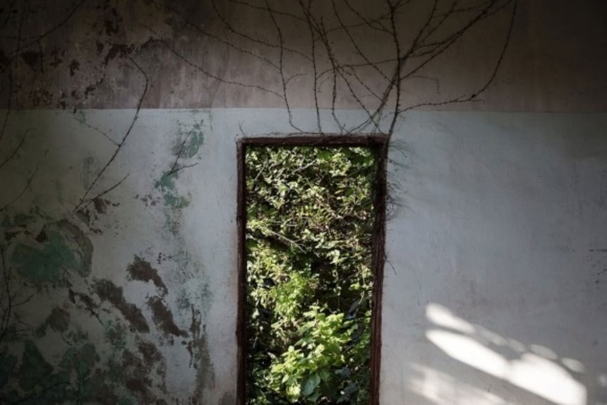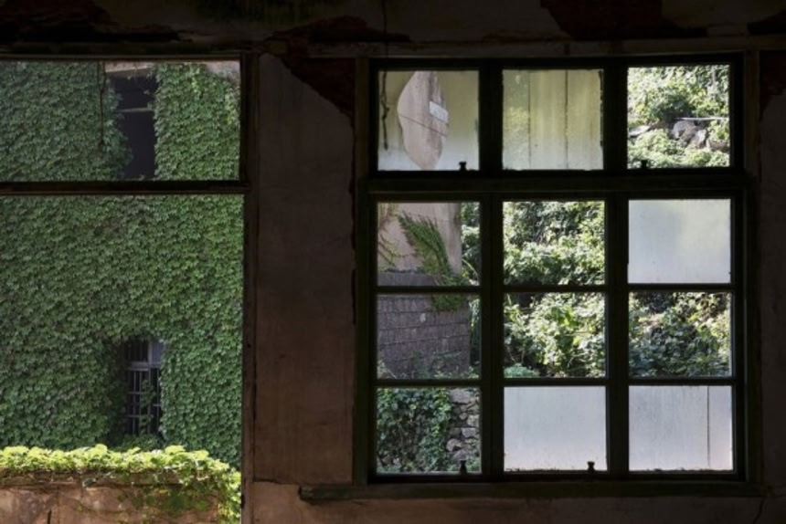 この画像を大きなサイズで見るがらんとなにもない家の破れた窓から見える、草木に覆われた建物