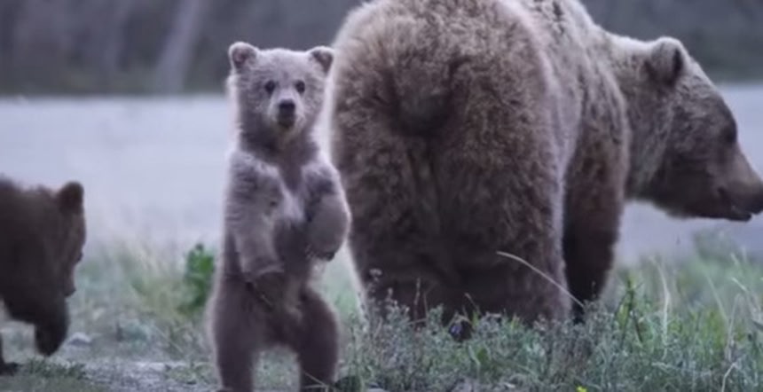 草なんかが視界を塞いで邪魔だから直立姿勢をとることがあるけど、この小熊もまだ背が低いから、興味を引いた物が良く見えるように立ち上がったんじゃないかな。それにしても、慣れてない直立姿勢でヨタヨタしてるのが可愛い。