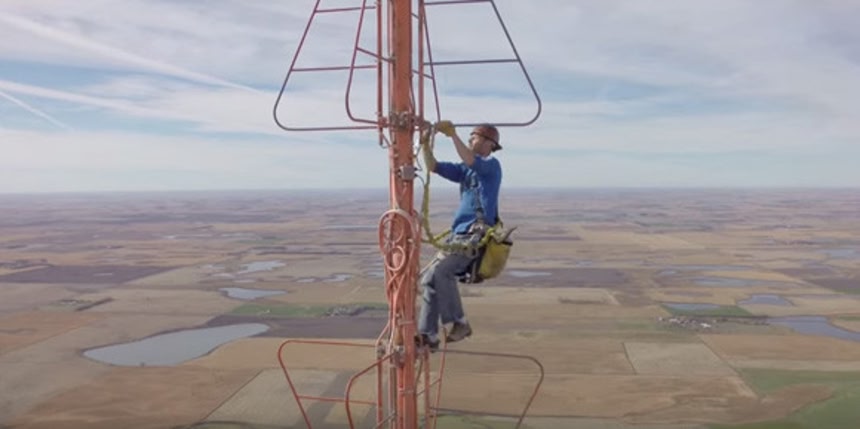 そのテレビ塔の高さは1200フィート。約366メートルで、高層ビルに例えるなら94階というハードすぎる高所となる。米サウスダコタ州のテレビ塔の最上部にある、航空障害灯の電球を取り替える作業は現在も手作業で行われており、1人の作業員が淡々とのぼり作業をしていくのだ。その様子がドローンカメラ(クワッドコプター)から撮影された映像が公開されていた。