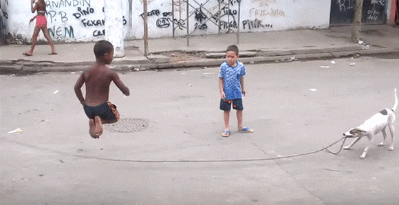 子どもたちの縄跳びの縄回し役をやっているのはなんと犬。ブラジルでの出来事だ。子供たちが飛びやすいように調節しているようにも見える。なんて賢くてかわいいんだ!