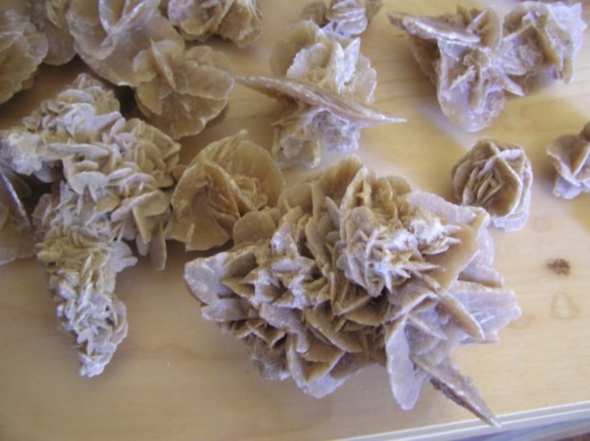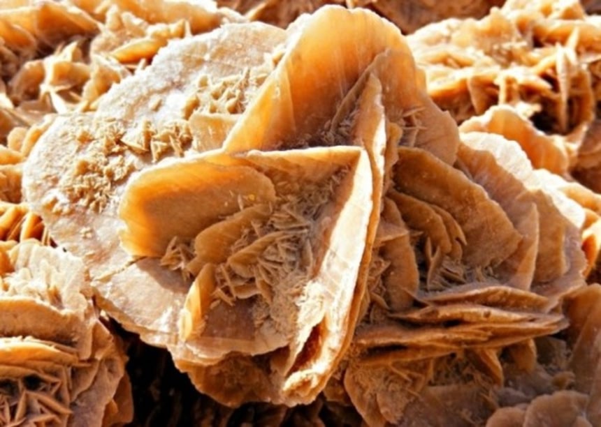 砂漠のバラには、石膏(硫酸カルシウム、CaSO4)でできたものと、重晶石(硫酸バリウム、BaSO4)でできたものがある。これらの鉱物は本来透明で滑らかなのだが、表面に付着した砂が結晶と一体化する。そのため、砂漠のバラは茶色くザラザラした石であることも多い。