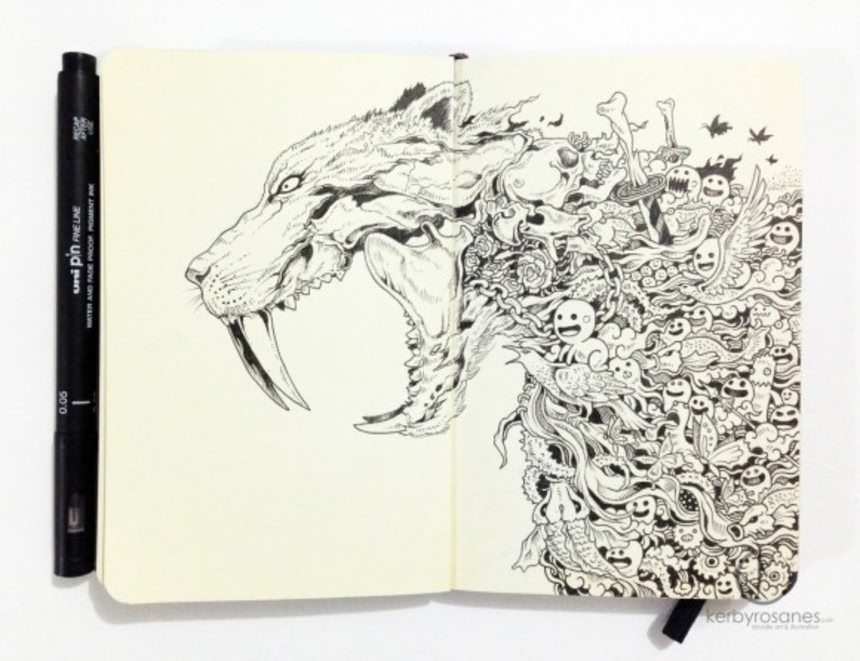 フィリピンを拠点に活動しているアーティスト、Kerby Rosanesの繊細なる作品は、動物やクリーチャーの中に様々なモチーフがぎっしりと詰め込まれたペン画アートである。