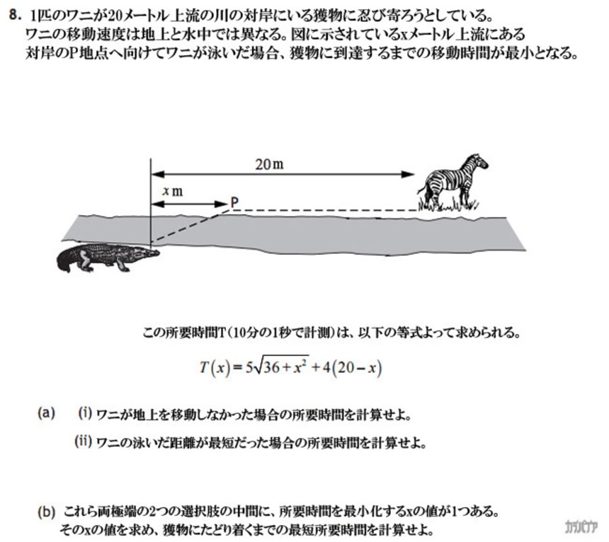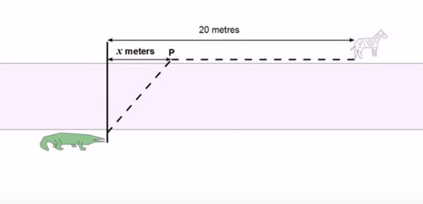 1匹のワニが20メートル上流の川の対岸にいる獲物に忍び寄ろうとしている。ワニの移動速度は地上と水中では異なる。図に示されているxメートル上流にある対岸のP地点へ向けてワニが泳いだ場合、獲物に到達するまでの移動時間が最小となる。