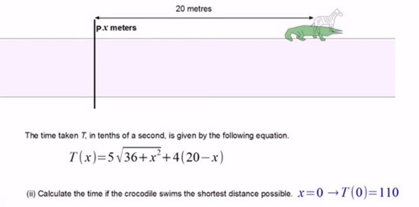 4:40 √36+x2は斜辺がこれを必要としているからで、ワニの水中移動距離と上流に移動した量の中に直角三角形ができる。√36+x2であるためには対岸までの距離が6であると推測できる。