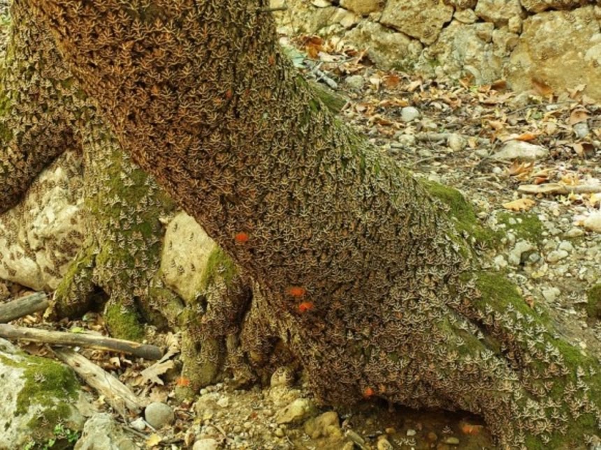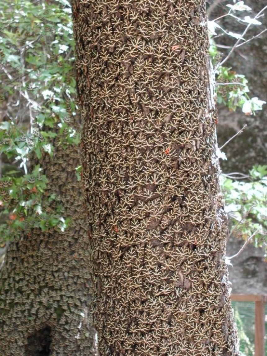 北米南部に分布するオオカバマダラ(Monarch butterfly)も、秋に暖かいメキシコへ向けて渡り鳥の様に移動するのは結構有名だけど、群れてる写真は、この蝶の谷に負けず劣らずグロイ。