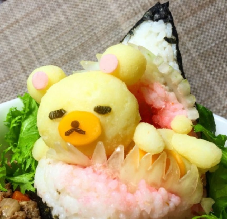 じゃがいも1個を皮むきしてゆでてマッシュする。それに砂糖大さじ1、片栗粉大さじ3を加えて混ぜ合わせ粘土状にし、乾かないようラップでつつんでおく。形を作ったらハムで耳を、鼻の丸い部分をチーズをくり抜いてつけ、最期に昆布で目と口の部分を作ったらできあがり。