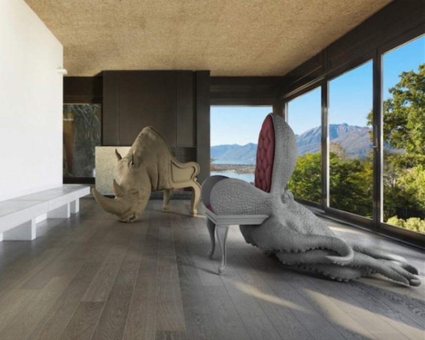 ゾウが、カバが、タコが、カエルがおしゃれでシュールな椅子やソファとなった。リアリティを追求しつつ、ばっさりと途中から座り心地の良い椅子に変貌している。