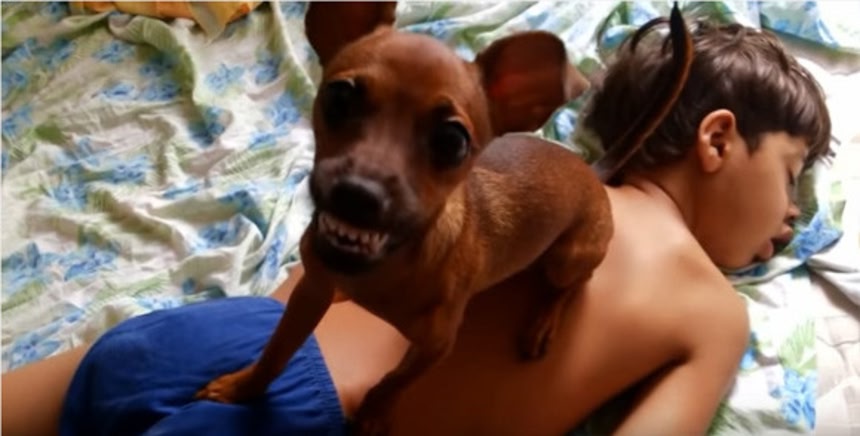 うつぶせになって気持ちよさそうに寝ている少年。そろそろ朝なので起こそうと父親が少年に触れたその瞬間、少年の愛犬であるジョンが完全プロテクト。少年に触れた父親の手をガチ噛みするのである。