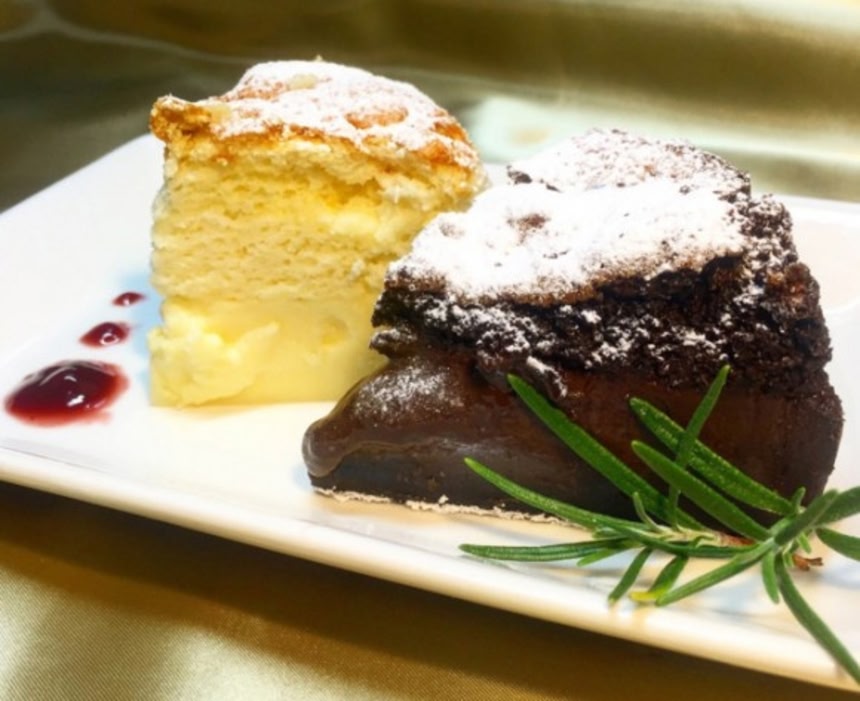 この画像を大きなサイズで見るフランス発の不思議なケーキがある。1度焼いただけなのに上はスポンジ、真ん中がカスタード、下がプリンのような食感を味わえる「マジックケーキ」と呼ばれているものだ。