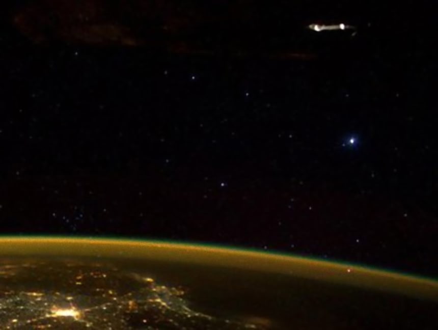 ISSから地球を撮影したものなのだが、インド南部の上空に、横に細長い発光物体が写りこんでいるのだ。