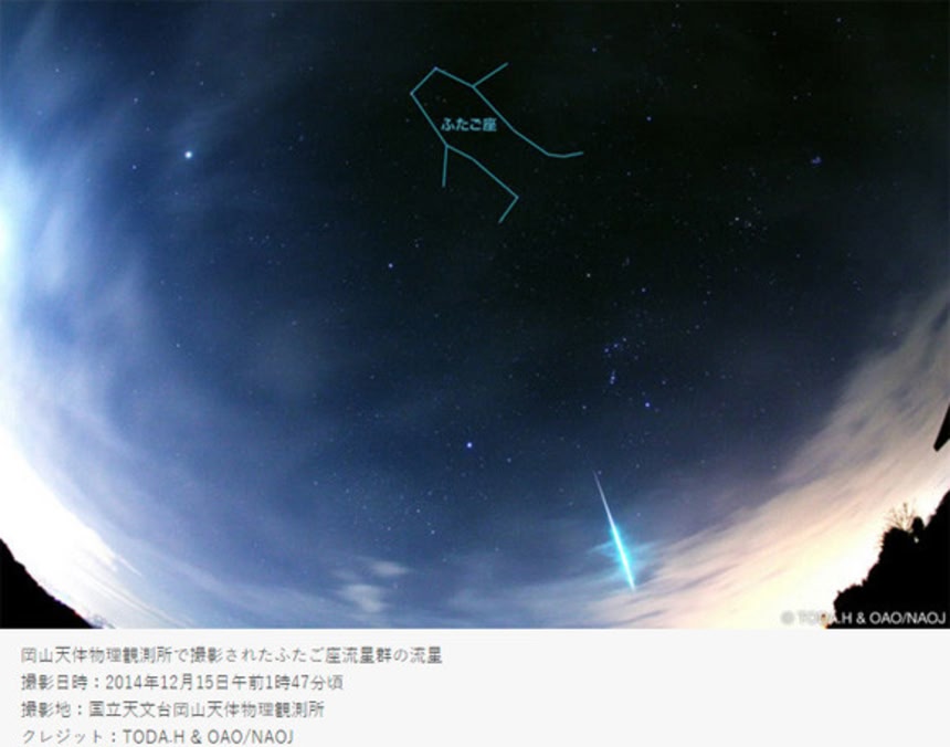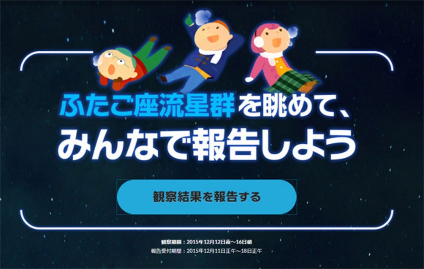 国立天文台では、ふたご座流星群が活動する時期に合わせて「ふたご座流星群を眺めよう 2015」キャンペーンを行っている。以下のサイトにアクセスして、観察結果を報告しよう。
