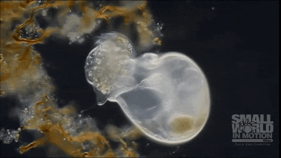 こちらがその作品である。繊毛虫(せんもうちゅう)同士での共食いの様子を撮影したものだ。トラケリウス属の繊毛虫が、同じくカンパネラ属の繊毛虫をがっつり一口で丸呑みする。
