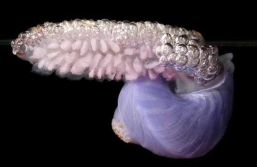 この画像を大きなサイズで見る海外ではその形状から「ムラサキカタツムリ」と呼ばれているが、浮遊性のアサガオガイ科の巻貝であるアサガオガイは粘膜でできた泡をつねに体にひっつけて、プカプカと海の中を漂っているユニークな貝である。