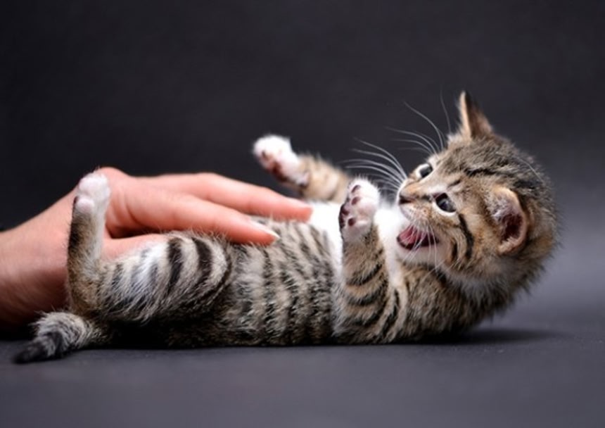 ウチの猫のお腹触ったら、前足で腕を抱え込まれて猫キック+甘噛みされた。
