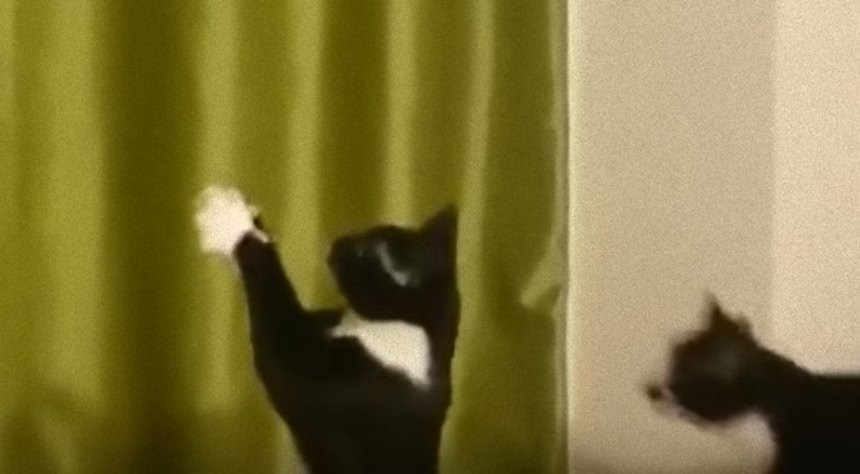 実はこれ、紐にボール紙の筒をくくりつけて、それをカーテンレールから吊るしてある。猫はこの筒でじゃれたいようだが距離感がうまくつかめずに怪しい踊りとなってしまったのだろう。
