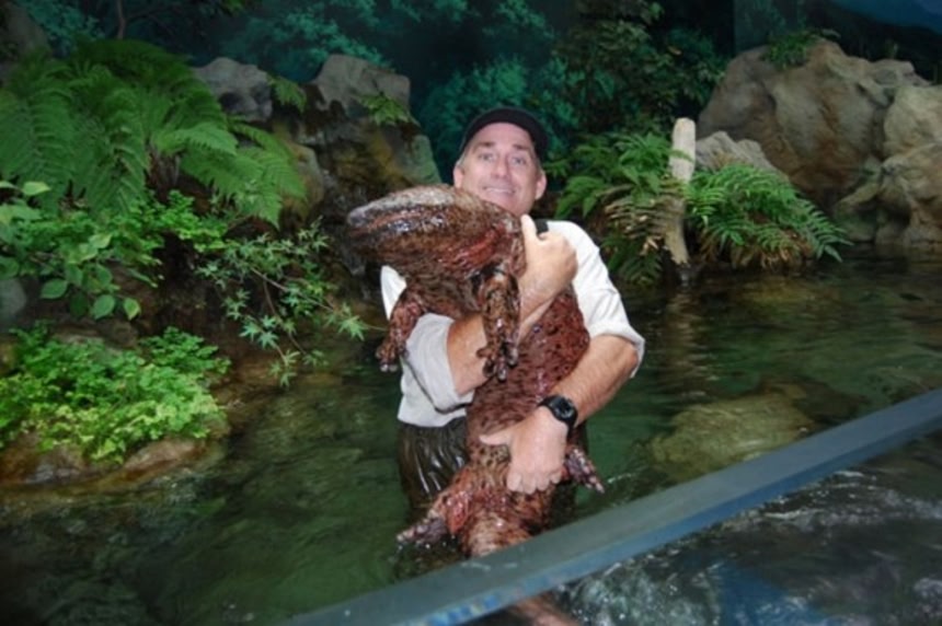 この画像を大きなサイズで見る中国の小川や湖に生息する、世界最大のサンショウウオ。体長は180センチにもなる。珍味であり、中国では漢方薬として古来から利用されてきたために、深刻な絶滅の危機にさらされている。