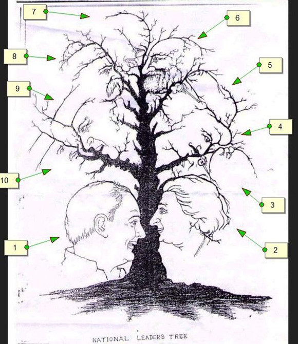 1本の木のイラストには10人の指導者たちが描かれているという。この絵は1980年代に無名のイラストレーター、ハーパーが描いたそうだが、顔を見つけるのも大変だが、全員の名前をいい当てるのもさらに困難を極めそうだ。歴史上の人物に詳しいマニアならわかるかな?