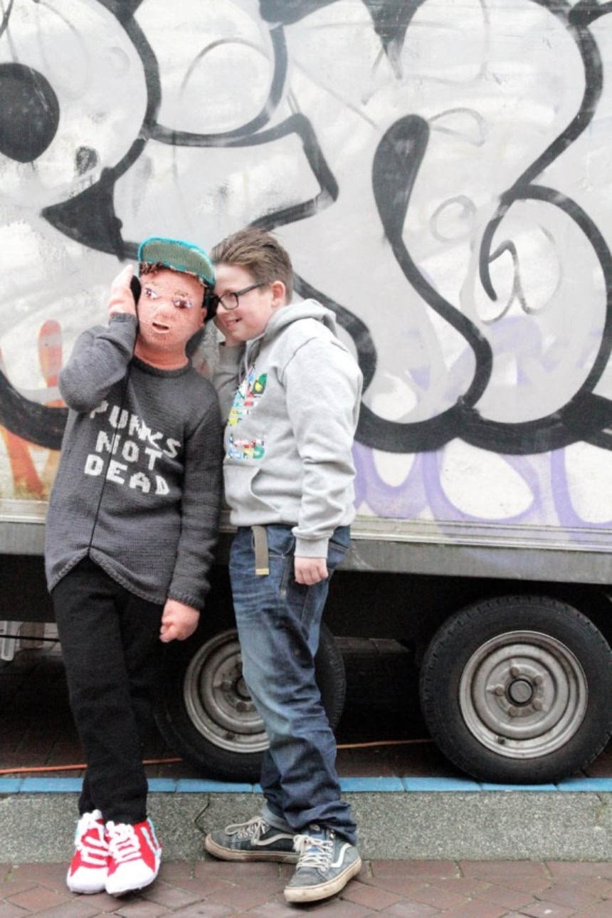 この画像を大きなサイズで見る小さい子供の成長はとても早いもの。去年まで着られていた服が今年にはもう着られなくなってしまう。愛する息子の成長を何か記録に残したい。そう思ったオランダのテキスタイルアーティストで、ニットクラブ「Geluk(フルック)」の設立者であるMarieke Voorsluijsさんは、子供を頭からまるごと包み込める等身大のニット着ぐるみを完成させた。