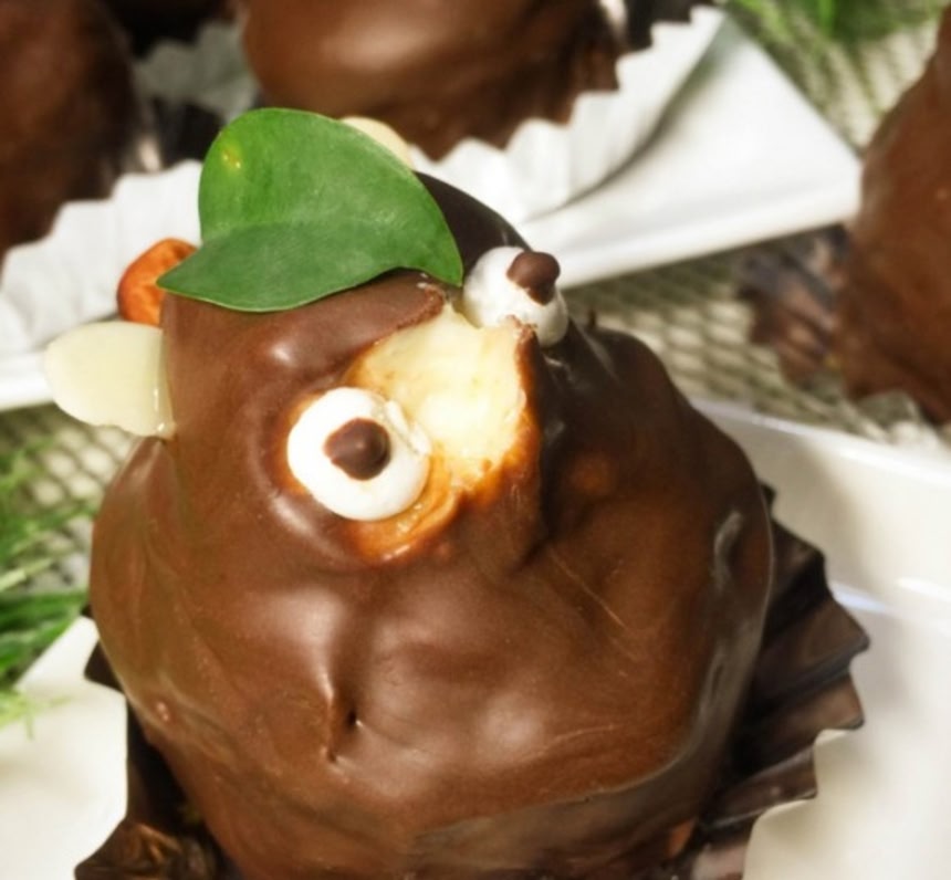 この画像を大きなサイズで見るスライスアーモンドを耳、アーモンドを尻尾にし、チョコで固まらないうちに指で目の部分をスッとつまみ、冷蔵庫で30分程冷やし、取り出して、生クリーム(バタークリーム代用)で白目を入れチョコで目を入れたら出来上がり。