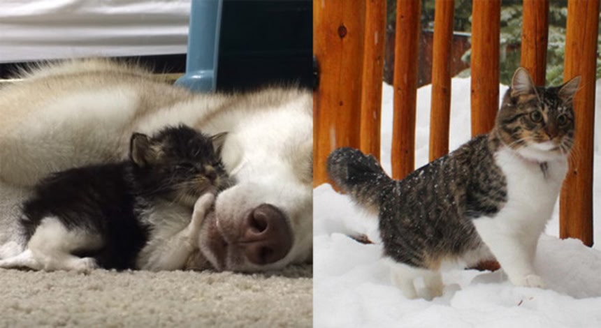 この画像を大きなサイズで見るまだ母親のミルクが必要な時期、一人ぼっちでさまよっていた猫が迷い込んだ先はハスキーのお母さんのいる家だった。