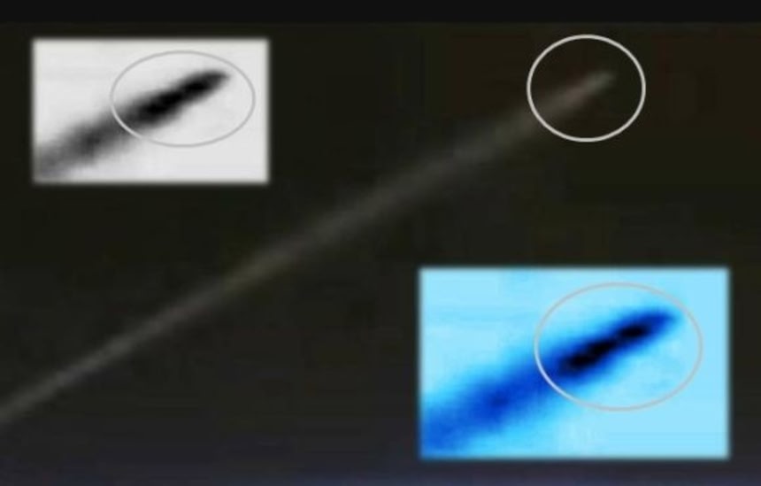大気圏外で飛行機雲とか軌跡ができるわけないからデブリや隕石ではないと思う。