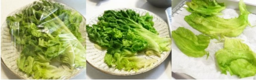 - レタスも豆腐同様に500w30秒ほど温めて取り出し、粗熱がとれたらキッチンはさみなどでシュウマイの底・側面を覆う大きさと、幅4cmほどでシュウマイに巻き付けられる長さの2種類のサイズにカットしておく。(加熱しないとかさばって成形しにくい)