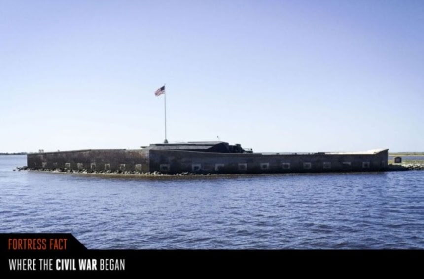 チャールストン港の中心にある小さな岩の島に作られた、7万トンのこの花崗岩要塞は、多層に渡る大砲の列を備えていた。のちに、ここは南北戦争の火ぶたが切られた場所として有名になった。早い時期に南軍がここを支配して、自分たちが使うために改築し、戦争中ずっと北軍を寄せつけなかった。