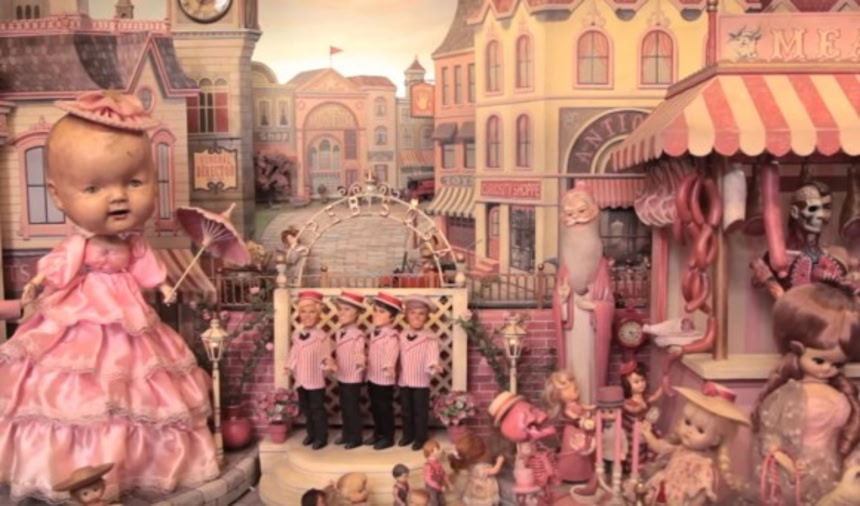 パッと見はピンク色のメルヘンな様相を醸し出してみると、よく見ると肉や頭蓋骨に満ち溢れている、シュールで不気味な機械仕掛けのジオラマ「メモリー・レーン(Memory Lane)」