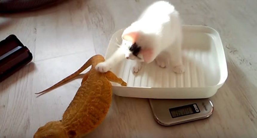 アゴヒゲトカゲの体重をはかろうとしていたところ、子猫がやってきて一緒に体重計に乗ってきた。そのままトカゲをギュゥっと抱きしめてスヤスヤ。時々寝返りをうつもんだからトカゲもやれやれだよ。