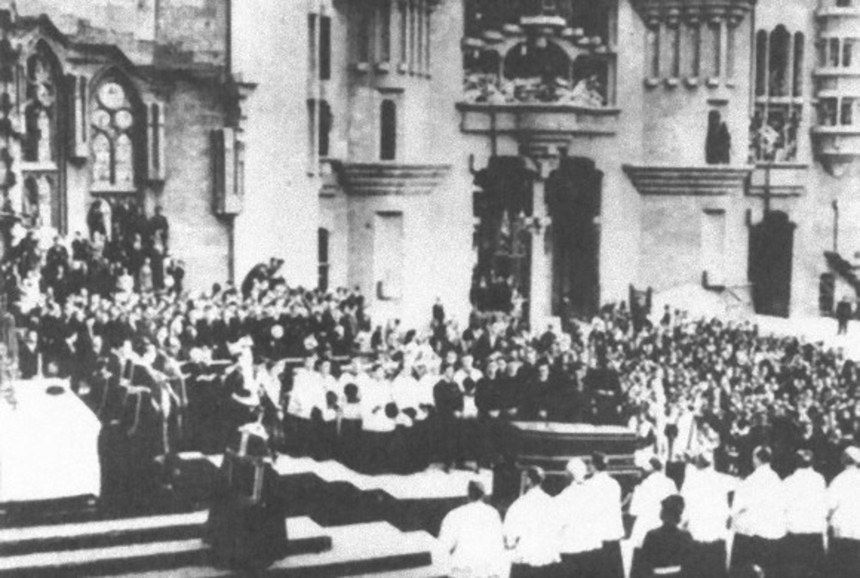 この画像を大きなサイズで見る翌日になってやっと、サグラダ・ファミリアの司祭が、この浮浪者のような負傷者が有名な建築家であることに気づいたが、時すでに遅しだった。二日後の1926年6月10日、ガウディは息をひきとった。バルセロナ市民はガウディの死を悼み、その神がかった業績を褒めたたえた。葬列は市内をねり進むほどの壮大なものになり、遺体は、結局未完で終わった巨大なサグラダ・ファミリアの地下に安置された。