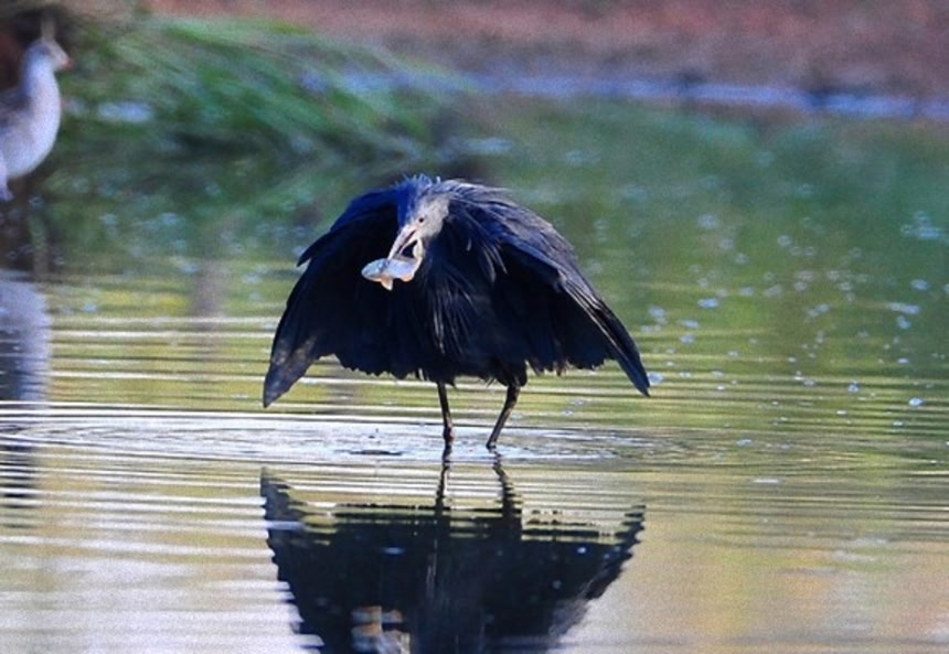 この行動は、クロコサギが作ったシェルターと影を安全な隠れ場所だと思った魚たちをおびき寄せるため。影を作って水の中にいる魚を見やすくするという説もあるらしいがそれは違うと思う。それと、これもみとけ。