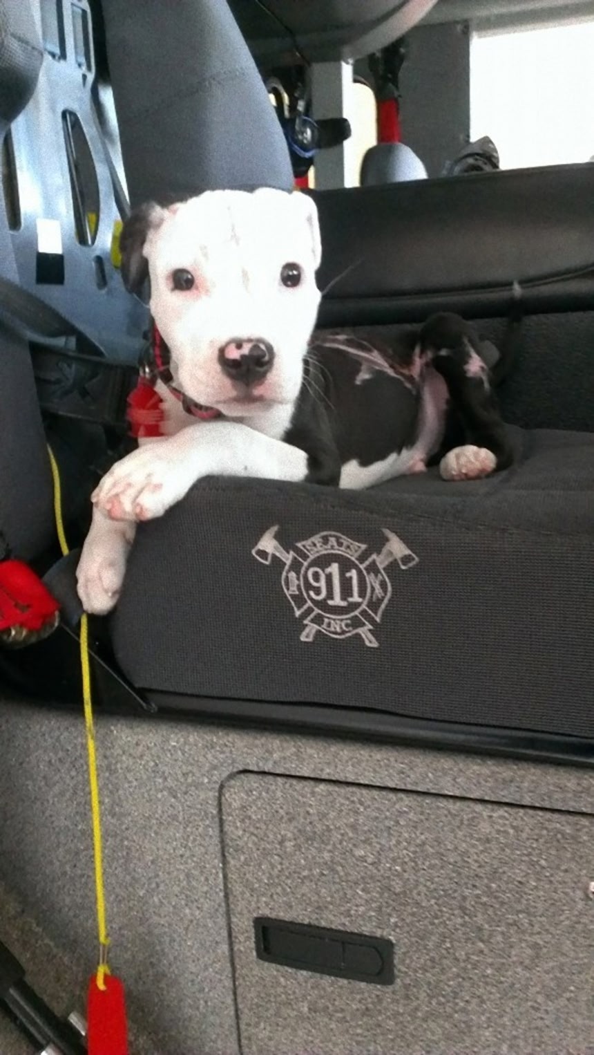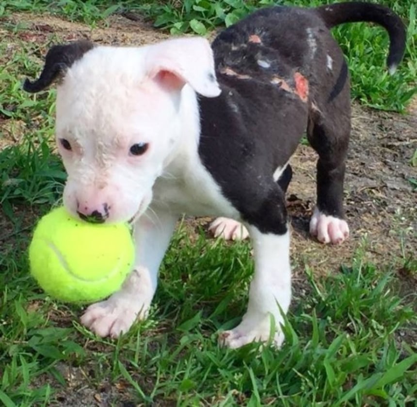 ジェイクと名付けられたピットブルの子犬は、火事で危うく命を落とすところだったが、消防士により救い出されなんとか一命をとりとめた。すぐに動物病院に運ばれ、治療を受けてたのだが、飼い主が経済的な事情からジェイクを手放すことになってしまった。