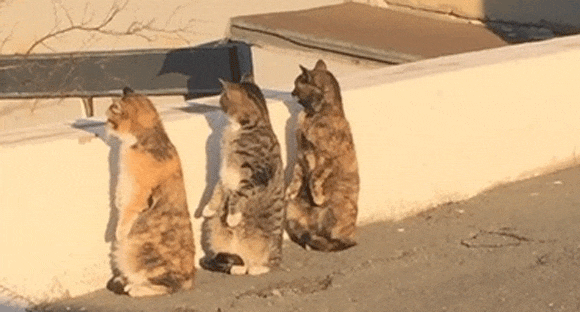 この画像を大きなサイズで見る「にゃんだ?にゃんだにゃんだ?」3匹が3匹そろって二足立ちして何かを監視しているようだ。世にも奇妙なこの光景を偶然目撃し激写しようとした投稿者。