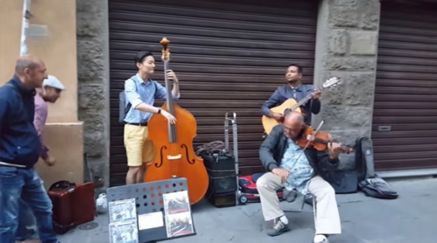 この画像を大きなサイズで見るそれはイタリアにある歴史と文化の街、フィレンツェで突如起きた。路上で美しい音色を奏でていた地元のミュージシャンたちだが、その音に魅せられ1人の観光客男性がやってきた。