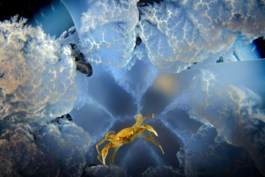 ※12 「クラゲ カニ 捕食」のワード検索で「巨大クラゲをタクシー代わりに利用するカニ」の記事が、このカラパイアの過去記事にあるのを見つけたが、そんな状態かも知れない。