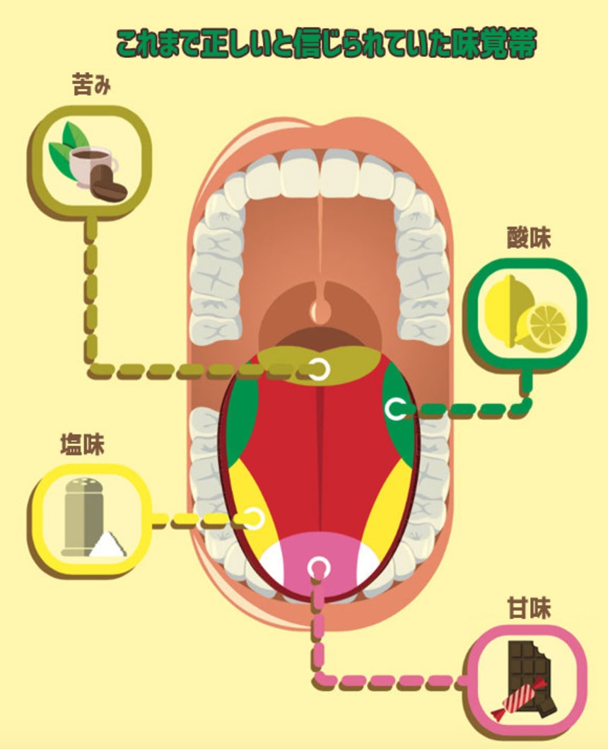 ボーリング博士の図は4種類の味を感じる場所を区分けしたものであった。甘味は舌の先端、塩味はその両脇から中ほどにかけて、酸味はさらにその後ろ、苦味が一番奥といった具合だ。第5の味覚、うま味には触れていない。