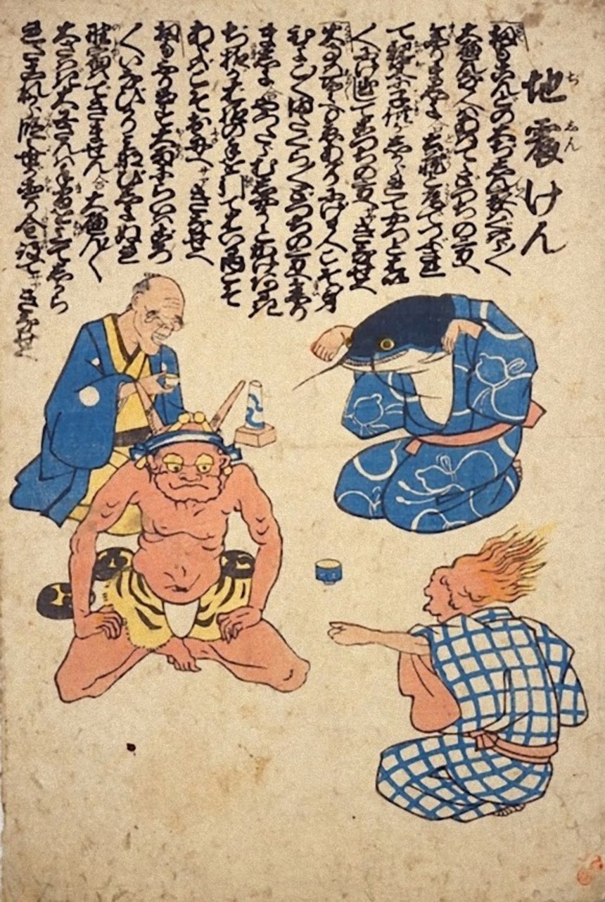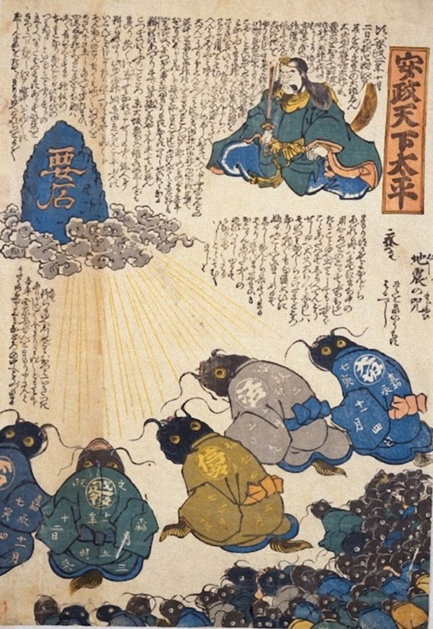 これは、オオナマズが地下で暴れることで地震が発生するという当時の民間信仰に由来する。ナマズは崇拝対象となり、庶民は、鯰絵を身を守る護符として、あるいは不安を取り除くためのおまじないとして、競うように買い求めたのだ。この流行が収束するまでのおよそ2ヶ月の間に多数の作品が作られた。