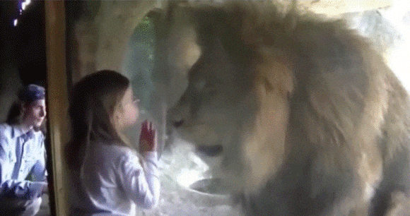 動物園でライオンを見つめていた女の子。ライオンも女の子を見つめている。両者の距離はガラス1枚分だ。こんなに間近にライオンの顔を見る機会なんてめったにないだろう。女の子はガラス越しにライオンにキスをした。するとライオンの反応は?