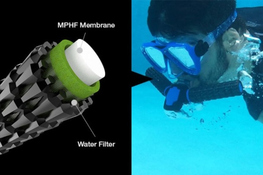 この画像を大きなサイズで見るそれほど深くは潜れないが、小型の装置を口にくわえるだけで45分間も潜水していられるなんて、ドラえもんの道具「エラ・チューブ」みたいだ。